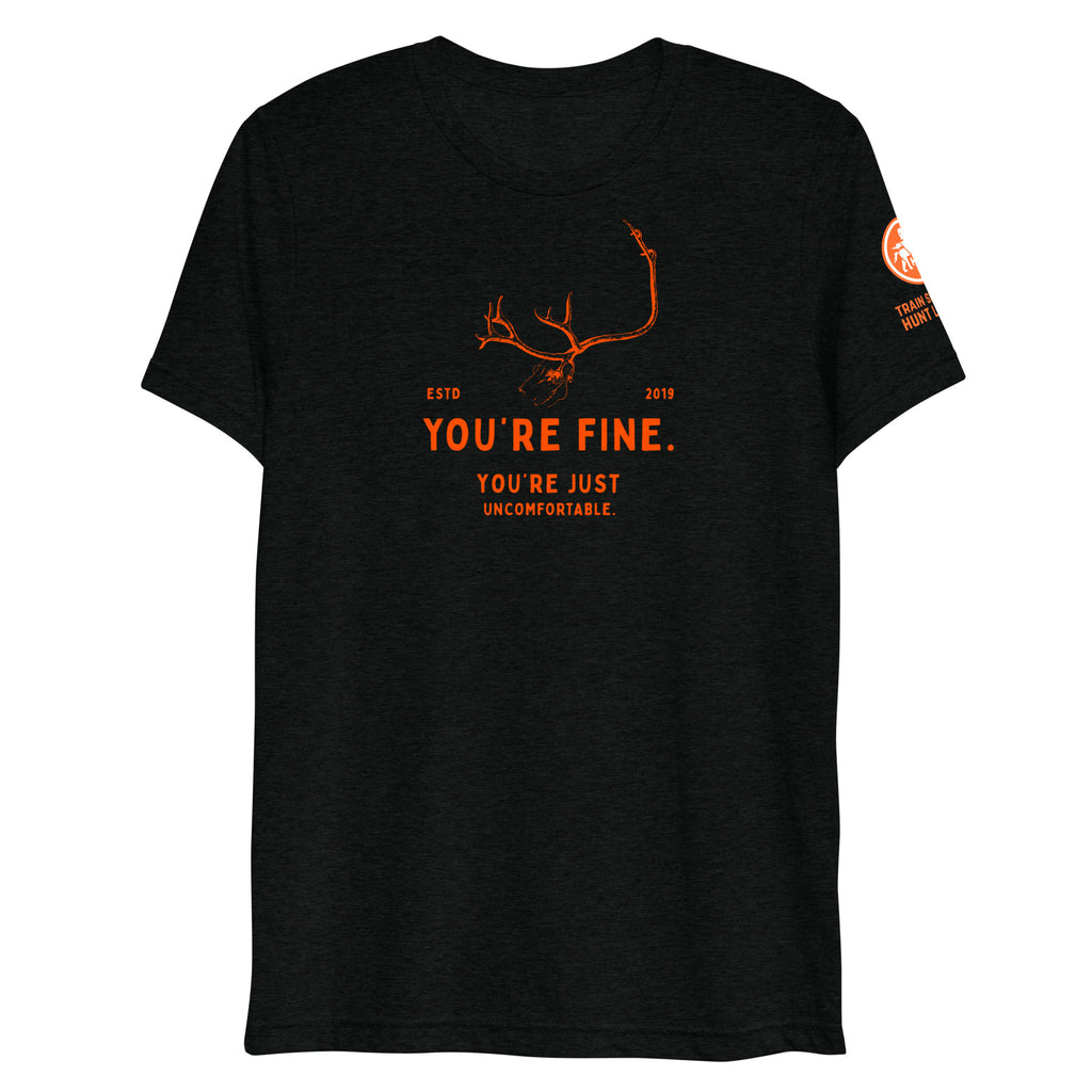 It became my mantra during every tough workout, and I started using it with clients. It stuck. Now, years later, you can use it as your own reminder by having it printed on your chest. Because it’s true, you know. You’re fine. You’re just uncomfortable.